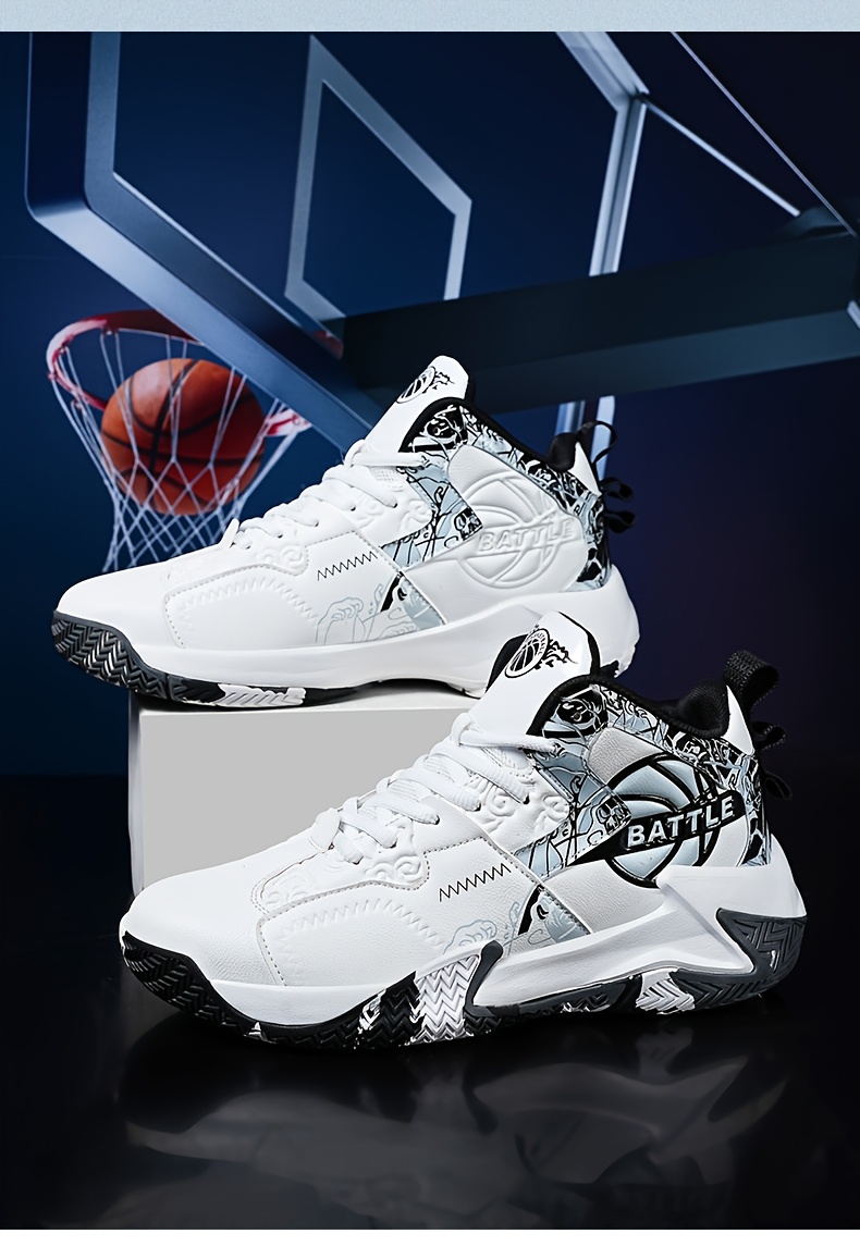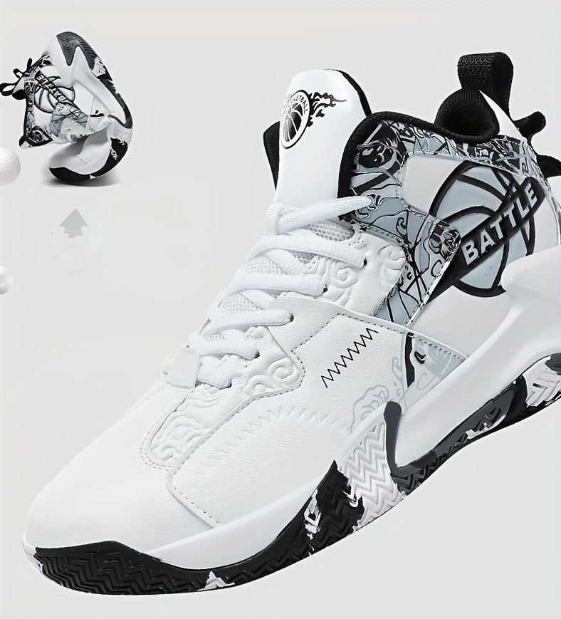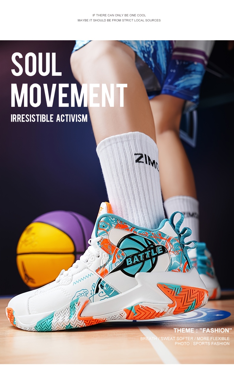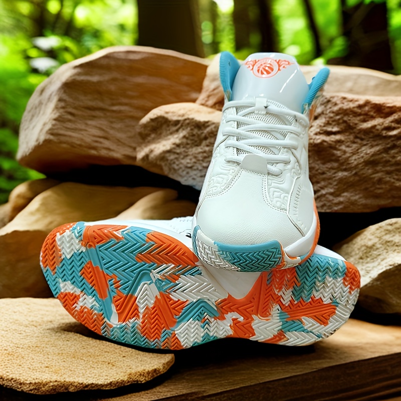 Stand out on the court or street with these high-top basketball sneakers, featuring a bold geometric pattern over a clean white base with vibrant blue and orange accents. Lightweight and shock-absorbing, the soft rubber sole delivers comfort and traction for both sports and everyday wear. Durable, stylish, and made to perform.