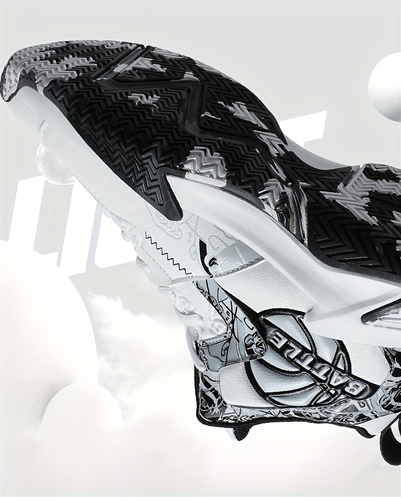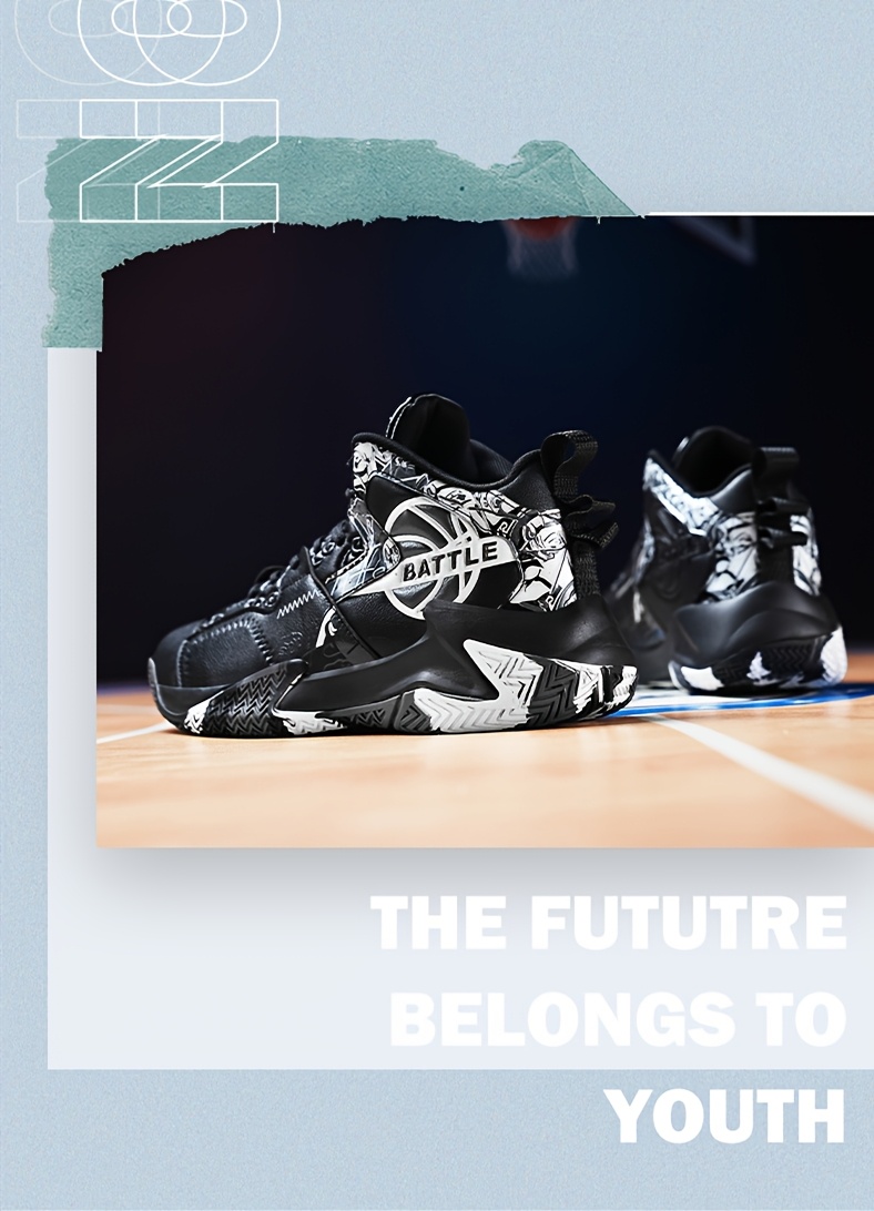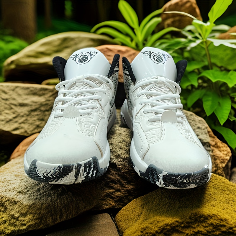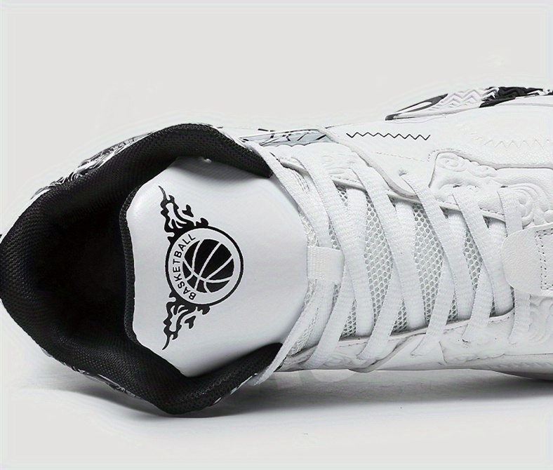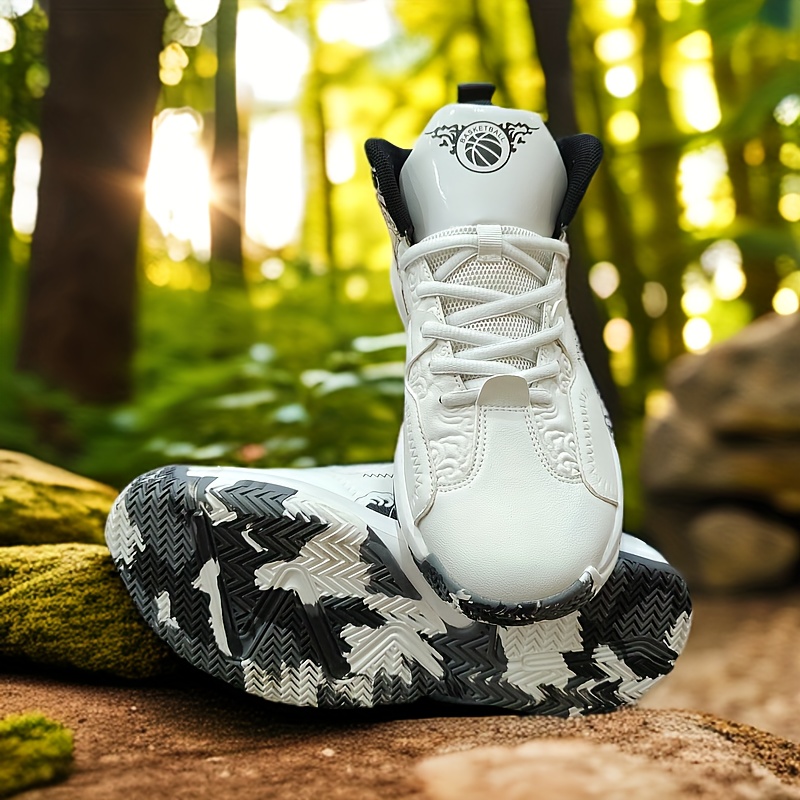 Stand out on the court or street with these high-top basketball sneakers, featuring a bold geometric pattern over a clean white base with vibrant blue and orange accents. Lightweight and shock-absorbing, the soft rubber sole delivers comfort and traction for both sports and everyday wear. Durable, stylish, and made to perform.