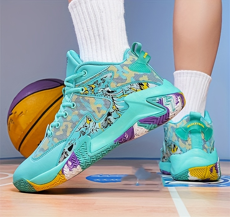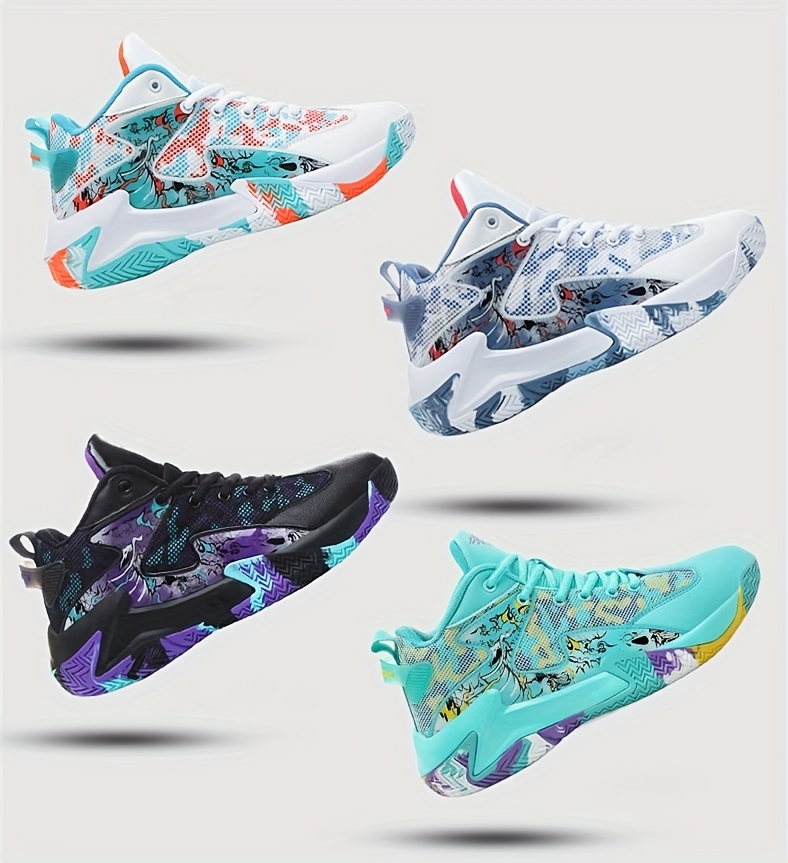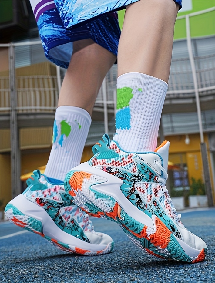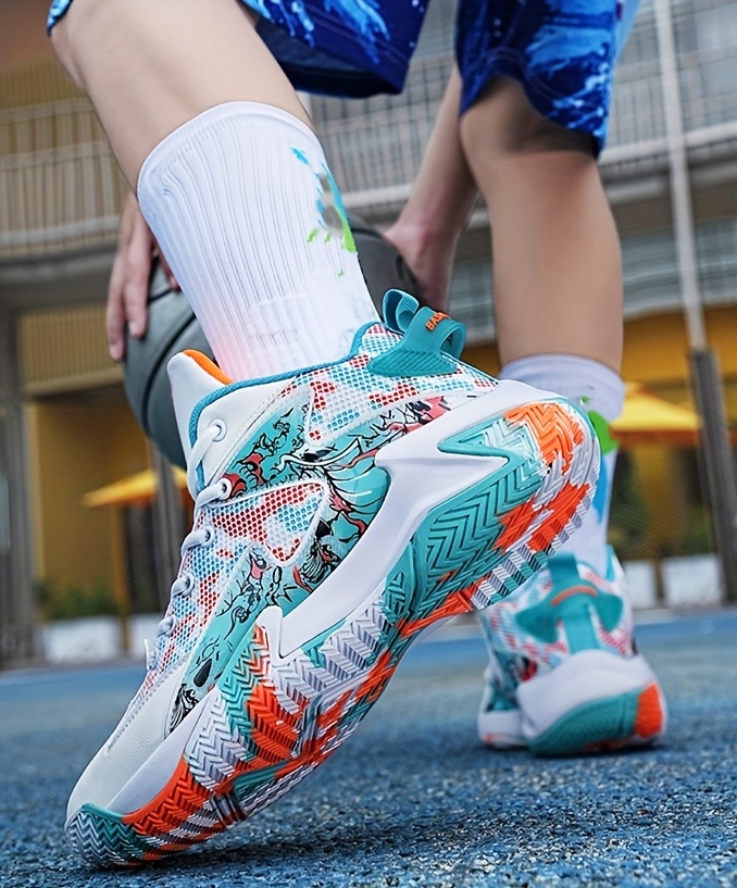 These high-top basketball shoes feature a breathable mesh upper and a shock-absorbing, non-slip rubber sole for stability and support on and off the court. Designed for both sports and casual wear, the lightweight build and vibrant teal and orange accents on a clean white base deliver a fresh, athletic look with all-day comfort.
