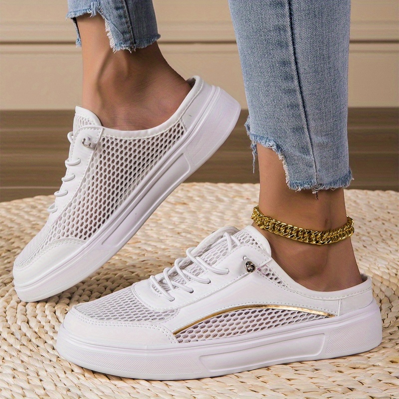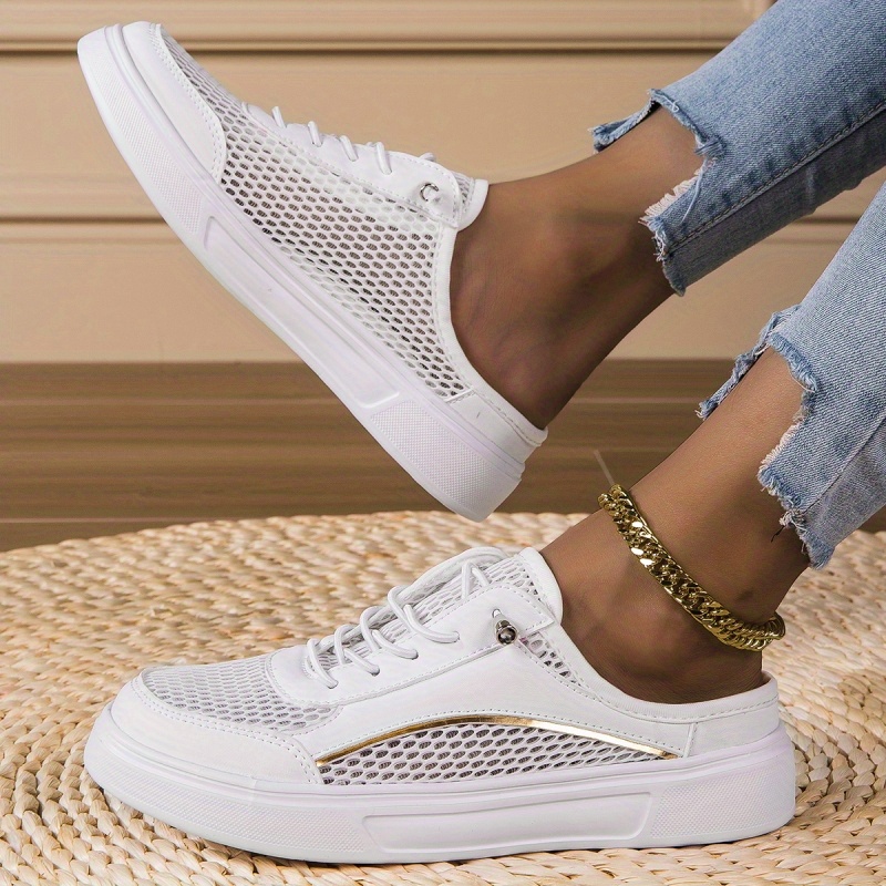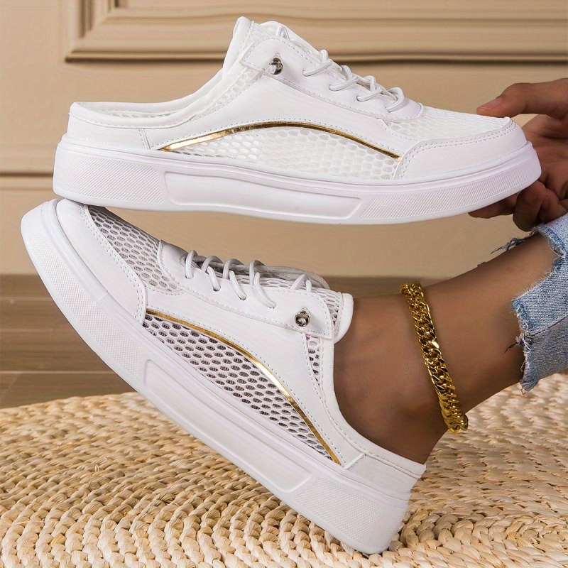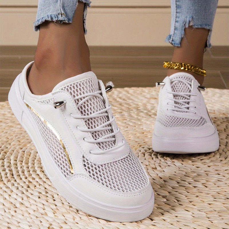 Stay stylish and comfortable with these Women’s Slip-On Casual Sneakers. Featuring a breathable mesh upper and non-slip EVA sole, these flat shoes are perfect for both indoor and outdoor use. The slip-on design ensures quick and easy wear, while the golden accents add a touch of elegance to the clean white look. Lightweight and supportive, these sneakers are ideal for everyday comfort with a modern, sporty feel.